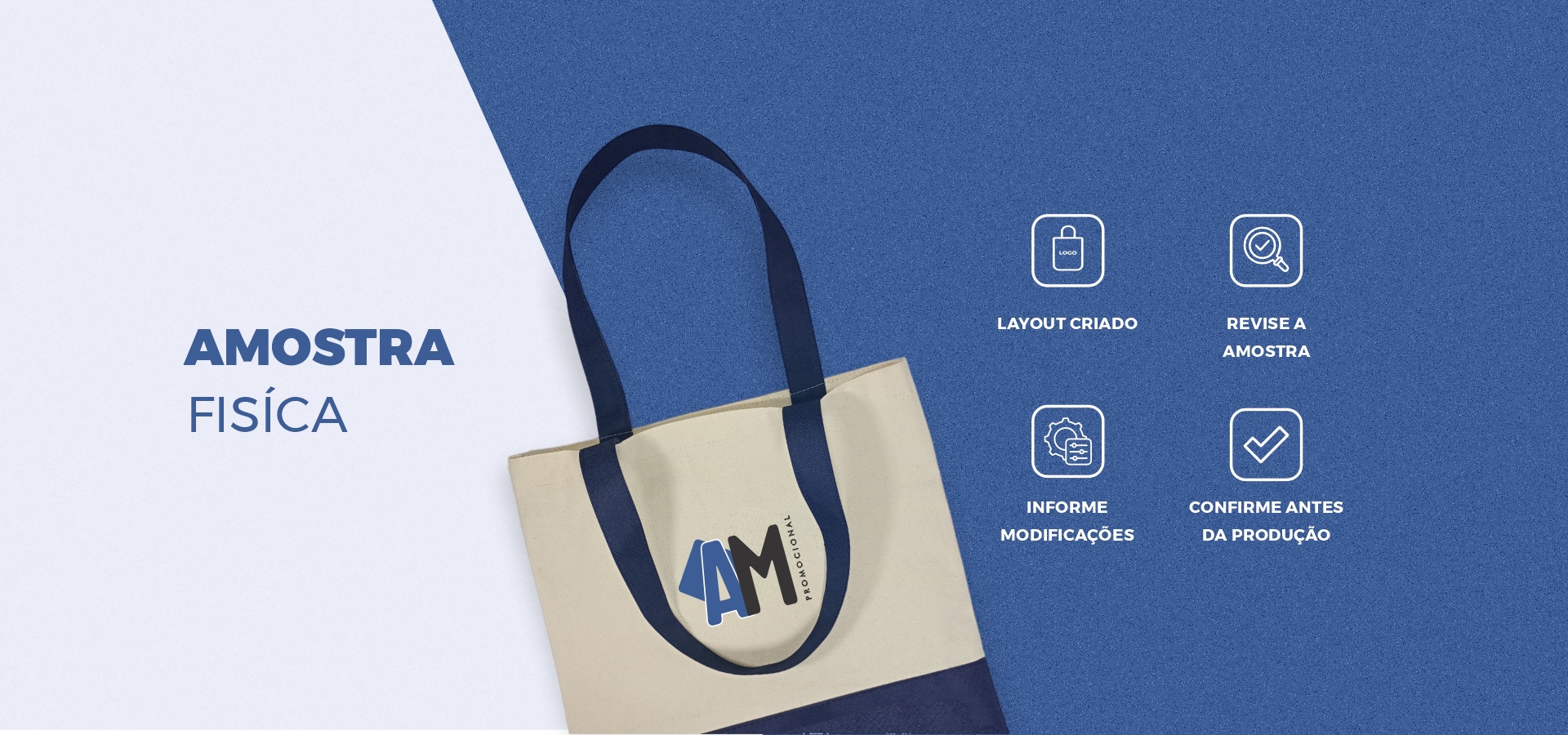 A AM atua desde 2017 com materiais promocionais personalizados, como bolsas e brindes, utilizando materiais resistentes.